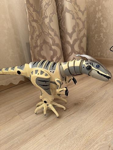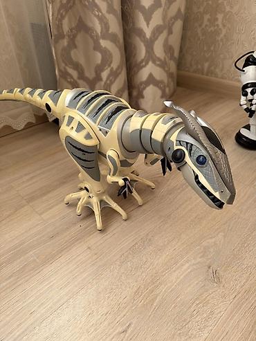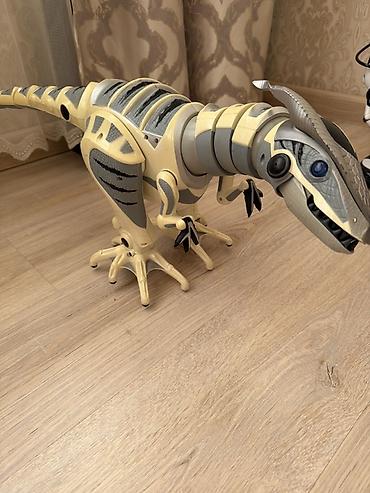 - Робот-динозавр: крупная интерактивная модель с подвижной головой, шеей, лапами и хвостом. Реалистичные чешуйчатые детали, контрастные вставки. На корпусе видны секционные панели и динамические «рёбра» — создан для демонстрации ходьбы и движений. Большие устойчивые лапы, открывающаяся пасть, светящиеся глаза (по конструкции). На боковой части — порт/отверстие для подключения датчиков/аксессуаров.