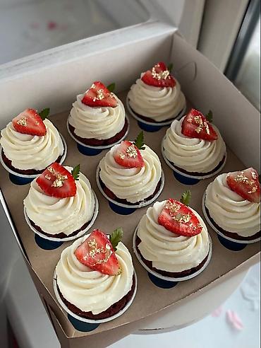 - Капкейки: нежный бисквит с воздушным кремом чиз, украшение свежей клубникой и съедобным золотом. Ровные шапочки крема, стабильные при транспортировке. Упаковка — фирменная коробка с ячейками на 9 шт.