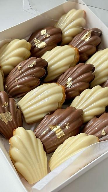 - Мадлен: классические французские ракушки на сливочном масле. Глазурь — бельгийский шоколад двух видов (молочный и белый), акцент — листовое съедобное золото. Коробка-ассорти.
