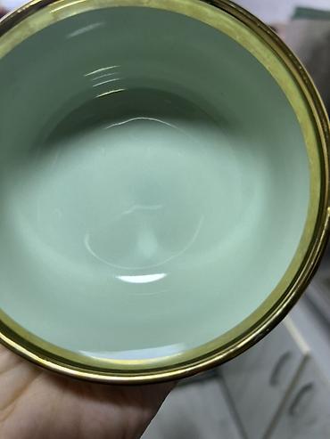 - Декор: широкая глянцевая золотистая окантовка по краю и тонкий золотой растительный орнамент по бокам