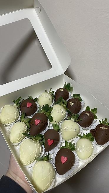 - Ассорти: свежая крупная клубника, покрытая молочным и белым шоколадом. Украшения — тонкие шоколадные узоры, сердечки, хрустящая малина/ягодная крошка, иногда листочки съедобного золота. Возможны половинки свежей клубники для акцентов.