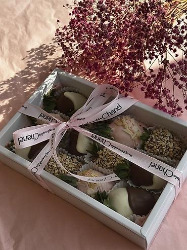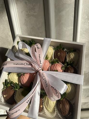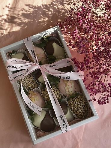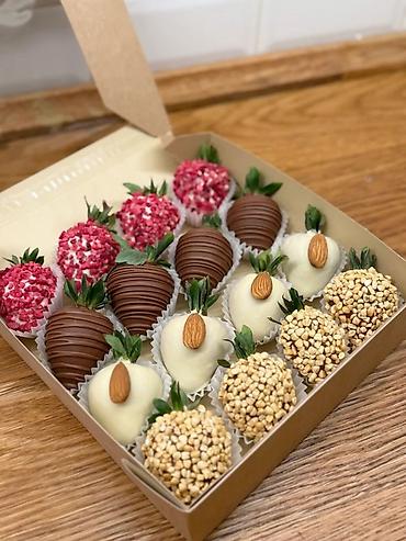 - Свежая крупная клубника, глазированная белым, молочным и розовым шоколадом.