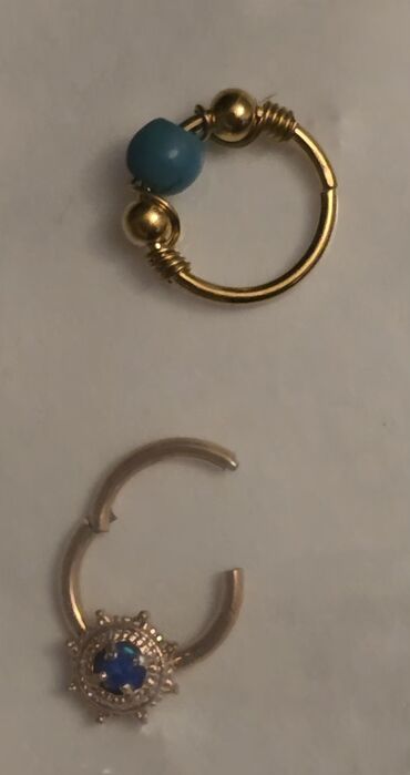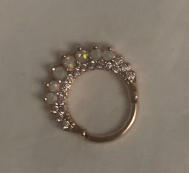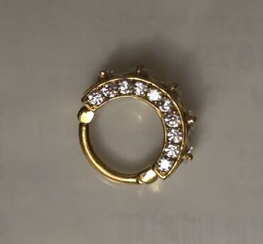 - Золотистое кольцо с прозрачными камнями по дуге (имитация бриллиантов), крепление типа кликер.
