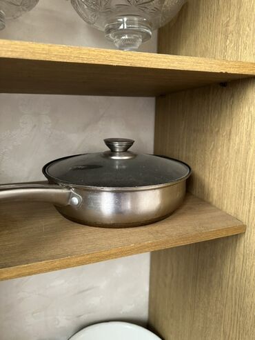- Низкая сковорода/сотейник из нержавеющей стали с крышкой из стекла и металлической ручкой.