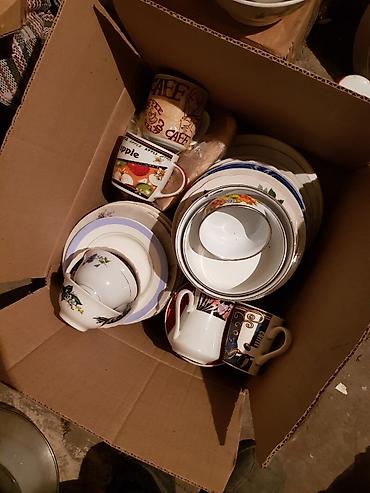 - Коробка столовой посуды: чайные и кофейные кружки с рисунками, чашки с блюдцами, пиалы/мисочки, глубокие и мелкие тарелки разных диаметров, салатники.