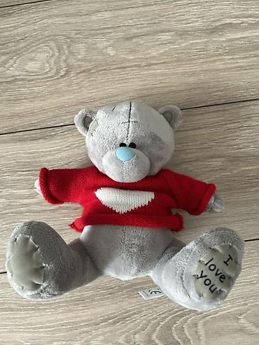 - Серый мишка в красном вязаном свитере с белым сердечком. На подошве лапы вышивка “I love you”. Классический плюш, удобный размер для объятий — около 20–25 см.