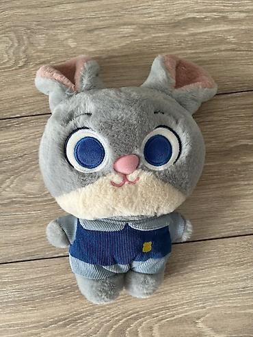 - Серый зайчонок с большими синими глазками в съёмном костюмчике: голубые шортики и тёмно-синяя жилеточка из вельвета с маленькой жёлтой нашивкой. Высота примерно 20–22 см.