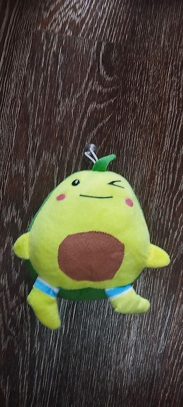 - Плюшевый авокадо-персонаж: ярко‑зелёный, с коричневой «косточкой» на животике, щёчками‑румянцами и под gui-листочком наверху. Есть петелька для подвешивания. Невысокий, округлой формы, короткие ручки и ножки с голубыми манжетами.