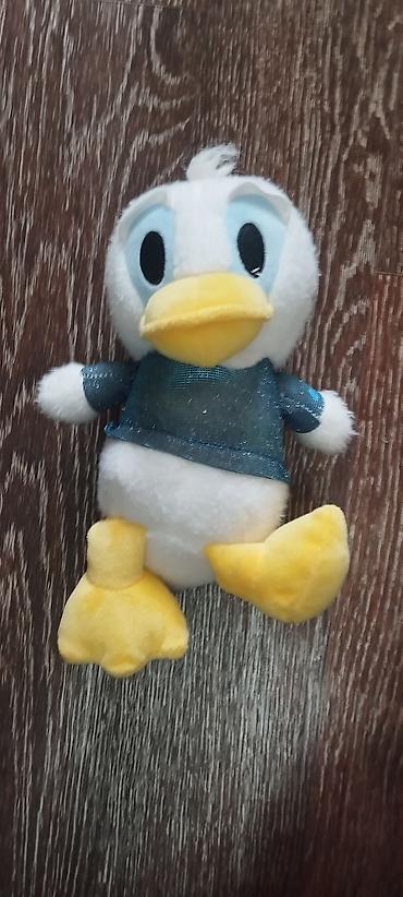 - Плюшевый утёнок: белый корпус с жёлтым клювом и лапками, большие овальные глаза. Одет в блестящую синюю кофточку. Мягкий на ощупь, устойчиво сидит.