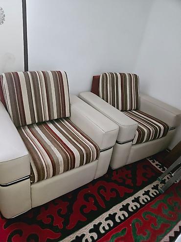 Набор мебели для дома - Диван и два кресла в едином стиле: светлые кожзам-борта и подлокотники, сиденья и спинки в полосатой обивке (оттенки бежевого, коричневого и терракотового). В комплекте под...