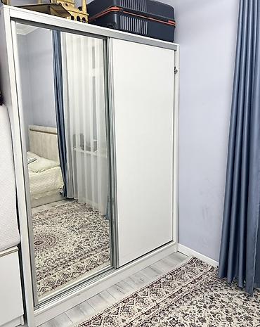 - Шкаф-купе на 2 двери: одна створка зеркальная во весь рост, вторая — глухая. Алюминиевые направляющие, нижняя рельса, фасады в белом цвете.