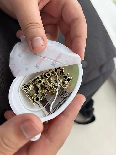 - Разборный металлический 3D-лабиринт золотистого цвета (несколько модулей/деталей, на шнурке). Детали помещаются в пластиковый контейнер с фольгированной крышкой.