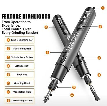 Подходит для гравировки, шлифования, полировки, резки, сверления и доработки изделий из дерева, пластика, смолы, мягких металлов, керамики и стекла, а также для моделизма, DIY и ювелирных работ. Компактная форма «ручки» обеспечивает удобный хват и точный контроль.