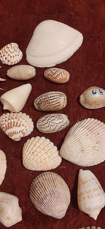 - Коллекция из разных видов и размеров: встречаются каури (гладкие «бобочки»), небольшие витые раковины, сердцевидки и гребешки с ребристой фактурой, овальные и каплевидные экземпляры с естественным рисунком.