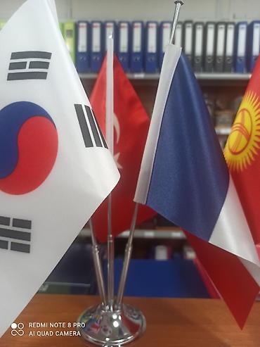 Набор настольных флагов включает флаги различных стран, таких как Россия, Кыргызстан, Южная Корея, Франция, Турция, Украина, Казахстан и Великобритания. Флаги установлены на устойчивой металлической подставке, которая обеспечивает их вертикальное положение. Набор идеально подходит для использования в офисах, учебных заведениях или в качестве элемента декора, символизирующего международные отношения и культурное разнообразие.