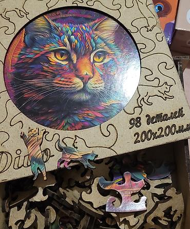 - Деревянный фигурный пазл «Кот» — 98 элементов, диаметр собранной картинки 200×200 мм. Фигурные резные детали (включая элементы в форме котиков и других фигур).