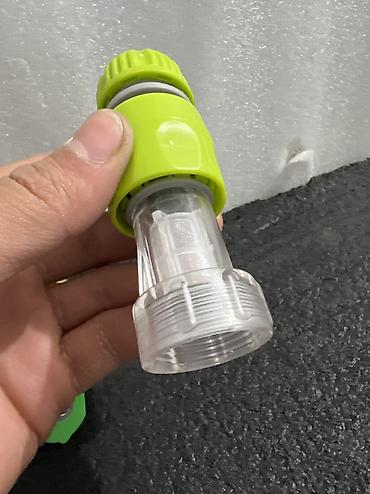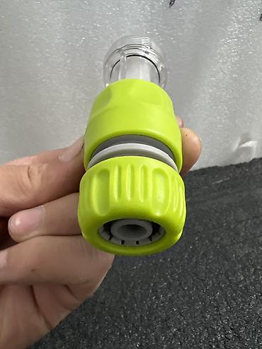 - Прозрачный пластиковый адаптер-удлинитель с резьбой, верхняя часть с зелёным зажимным кольцом под шланговое подключение.