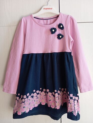 - Юбка темно‑синяя с принтом розовых цветов по подолу.