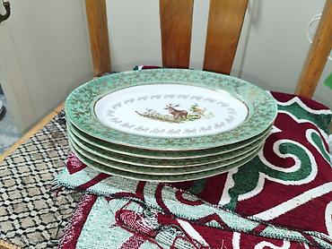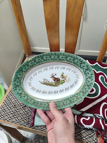- 1 овальное блюдо/сервировочное плато с зеленым бордюром, золотистым узором и центральным рисунком оленя — для мяса, рыбы, закусок. Размер примерно 30–34 см по длинной стороне.