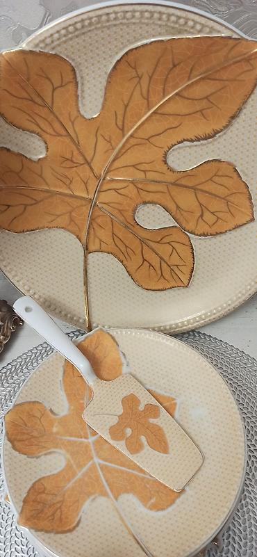 - Десертный комплект с принтом «лист»: крупное круглое блюдо, несколько тарелок и лопатка для торта/пирога в одном стиле (бежево‑золотистые тона, обводка под золото).