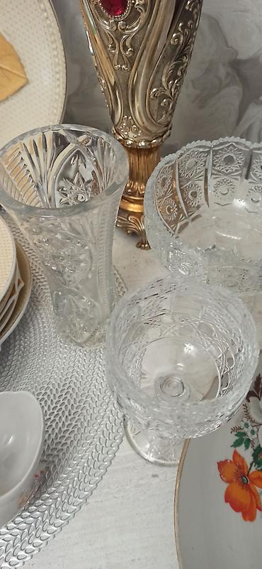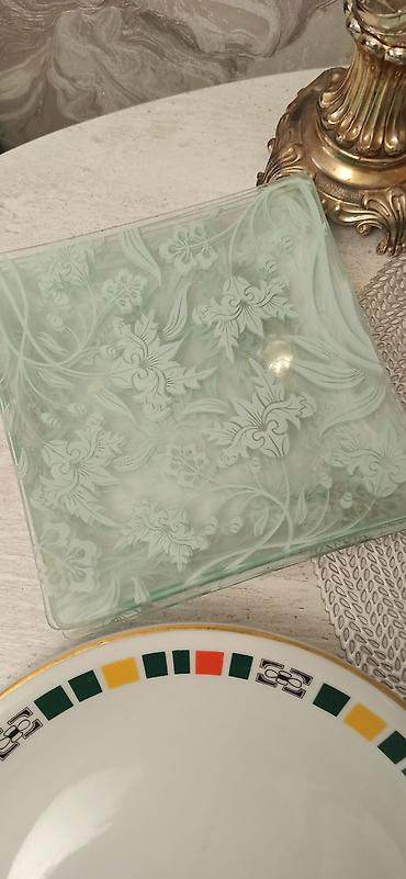- Стеклянная посуда: резные хрустальные/стеклянные бокалы и креманки, квадратное стеклянное блюдо с матовым растительным узором.