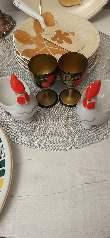 - Пара латунных/металлических бокалов на ножке с росписью под хохлому (черный фон, красные ягоды, золотистый внутри).