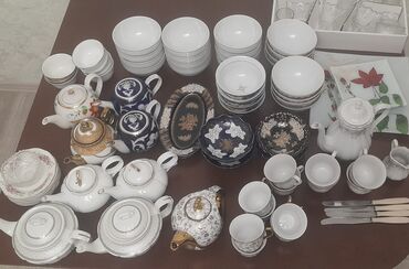 ФарфорБольшой набор разнообразной посуды, включающий в себя чайники, чашки, тарелки и миски. Предметы выполнены в различных стилях, от классического белого фарфора до изделий с золотистыми и синими узорами. Набор подходит как для повседневного использования, так и для сервировки праздничного стола.
