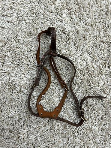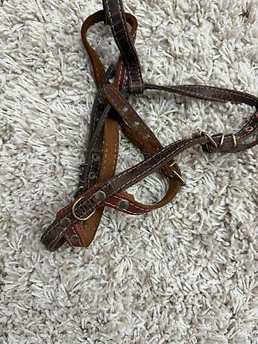 - Кожаная шлейка коричневого цвета с тиснением под рептилию: пряжки, заклепки и D‑кольца для крепления поводка, контрастная прошивка.