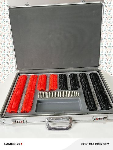 - Полный комплект пробных линз сферических и цилиндрических с шагом диоптрий от малых значений; цветовая маркировка (красные/чёрные) для удобства работы.
