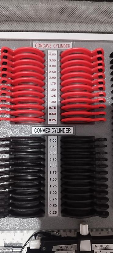 - Металлическая/регулируемая пробная оправа с лимбами для установки оси цилиндра и шкалами расстояния между зрачками.