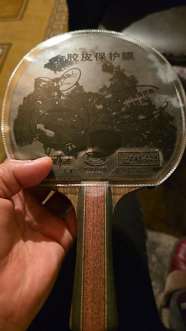 - Ракетка 2: DOUBLE FISH – многослойная деревянная основа, рукоять с вставкой из тёмного и красного шпона и логотипом Double Fish. С обеих сторон установлены красные накладки YINHE, под защитной плёнкой с рисунком; на накладках видны фирменные тиснения YINHE/ITTF 49-025. Универсальный игровой характер: стабильный контроль, комфортная скорость, удобна для обучения и любительских матчей.