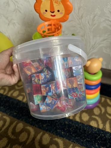 - Ведёрко с набором маленьких кубиков с картинками мультгероев — для сортировки, выкладывания узоров и первых построек.