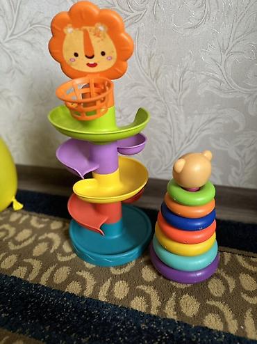 - Пирамидка с 7 яркими кольцами и фигуркой мишки сверху — тренирует мелкую моторику, цветовое восприятие и координацию.