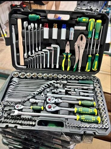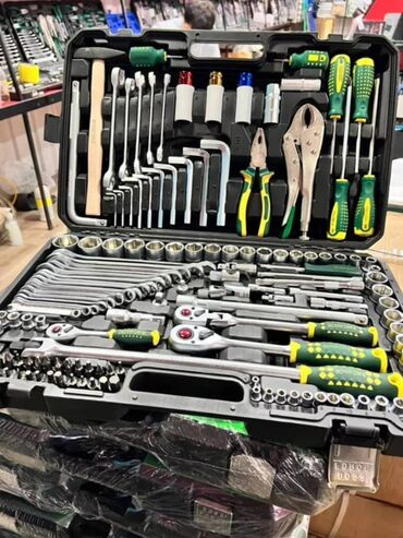 Комплект для слесарных, авто- и бытовых работ. Все элементы разложены по формованным гнёздам, есть удобная ручка для переноски и металлические замки.