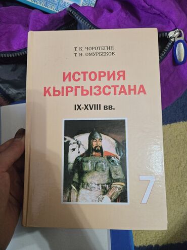 - История Кыргызстана, 7 класс: «IX–XVIII вв.». Авторы: Т. К. Чоротегин, Т. Н. Омурбеков. Твёрдая обложка, иллюстрация воина на коне.