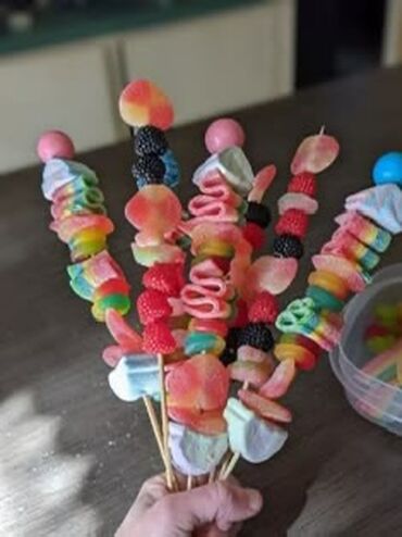 - Яркие ассорти на деревянных шпажках: фигурный мармелад (сердца, кольца, змейки, ягодки, «глазки», колечки и др.), зефирки/маршмеллоу, жевательные конфеты, леденцы на шарике.