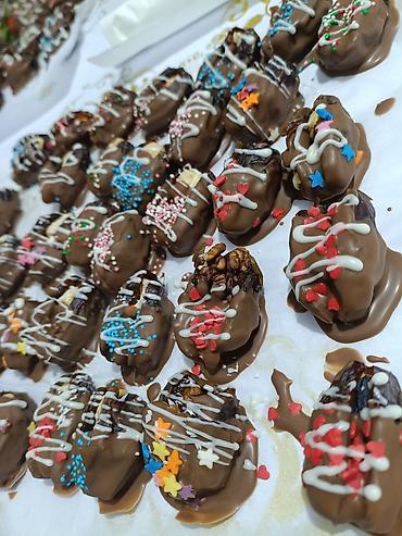 - Финики: крупные, без косточки, наполнены орехами (фундук, кешью, грецкий орех и др.), часть с добавлением кусочков шоколада/начинок. Сверху покрыты молочным и/или белым шоколадом с декоративным декором (кокосовая стружка, сахарные посыпки, мини-звёздочки, сердечки, глазурные линии).