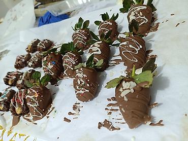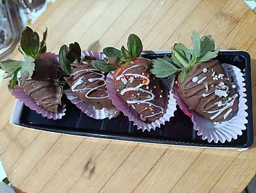 - Клубника: свежие целые ягоды на плодоножке, полностью окунуты в молочный шоколад и украшены белыми шоколадными полосками и посыпками.