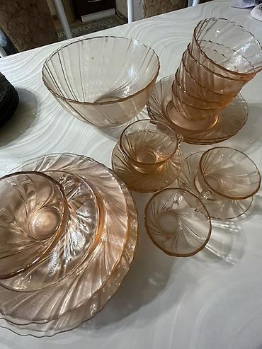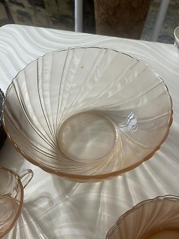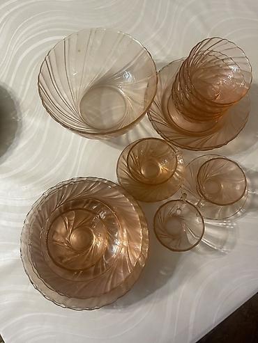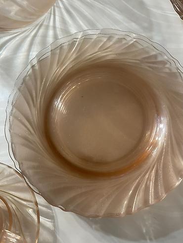 Набор столовой посуды из окрашенного стекла цвета «чайная роза» с волнообразным рельефом.
