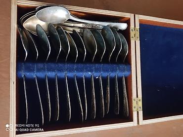 - Футляр: выполнен из массива дерева с глянцевым покрытием и вставками-инкрустациями по углам крышки. Внутри мягкая бархатная отделка синего цвета, индивидуальные ячейки для ложек, петли из латуни.