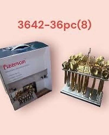 Набор столовых приборов Fizzman из 36 предметов золотистого цвета. Включает в себя 12 чайных ложек, 12 столовых ложек и 12 вилок. Поставляется с удобной подставкой для хранения, выполненной из нержавеющей стали.