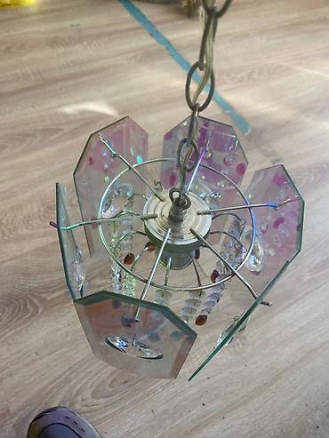 - Плафоны: многогранные стеклянные панели с радужным напылением, внутри подвесные стеклянные подвески/капли.