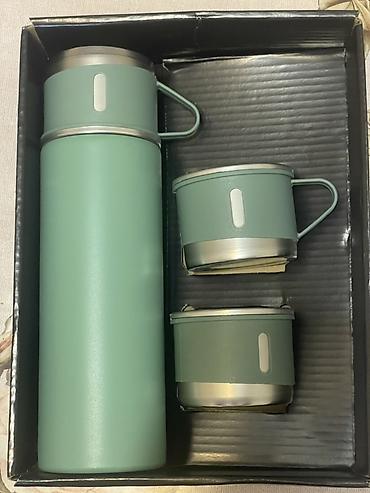 - Состав: вакуумный термос и две кружки с ручками в едином стиле.