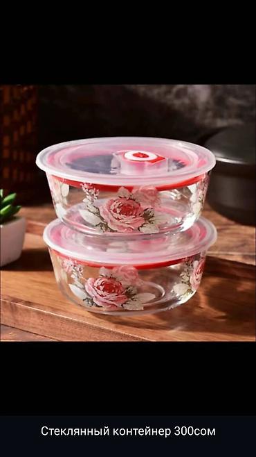 - Стеклянные контейнеры с цветочным принтом — круглая форма, прозрачное жаропрочное стекло, герметичные крышки с клапаном, удобны для хранения и переноса пищи. Цена на изображении: 300 сом.