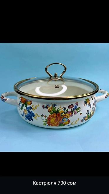 - Кастрюля с цветочным орнаментом — эмалированная, с двумя боковыми ручками и стеклянной крышкой с металлическим кольцом-ручкой. Подходит для ежедневной готовки и сервировки. Цена на изображении: 700 сом.