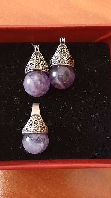 Серебряный комплект подвеска и серьги с мелкими камушками мерказит. Фиалетовый камень аметист.