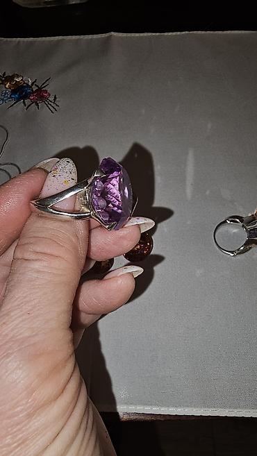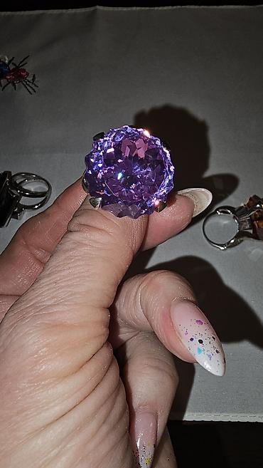 - Кольцо с фиолетовым камнем (фасетная круглая огранка, высокая посадка в трёхлапковом касте).