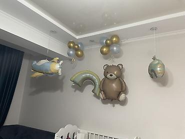 - Фольгированные фигуры: мишка, самолет, радуга, машина в пастельных тонах (молочный, голубой, золотой).