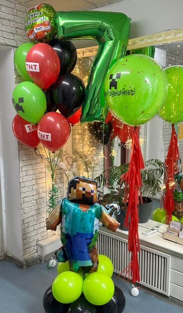 - Букеты латексных шаров зелёных, красных и чёрных с тематическими принтами «TNT» и пиксельными элементами.