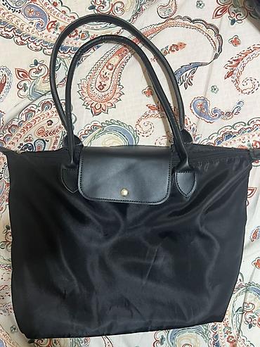 - Складная/лёгкая tote-сумка из плотного текстиля с кожзам-вставками: двойные ручки, верхняя молния, небольшой клапан со шпилькой-кнопкой.